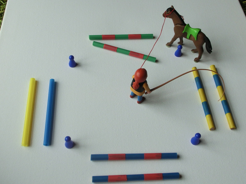 Wichtig ist nur bei allen Aufbauten, dass man es ziemlich genau abmisst. Also Qadrate sollten wirklich gleich lange Seiten haben und ein Zirkel wirklich rund sein! Mit Hilfe einer Longe und einem Weidezaunstab bekommt man das ganz gut hin.